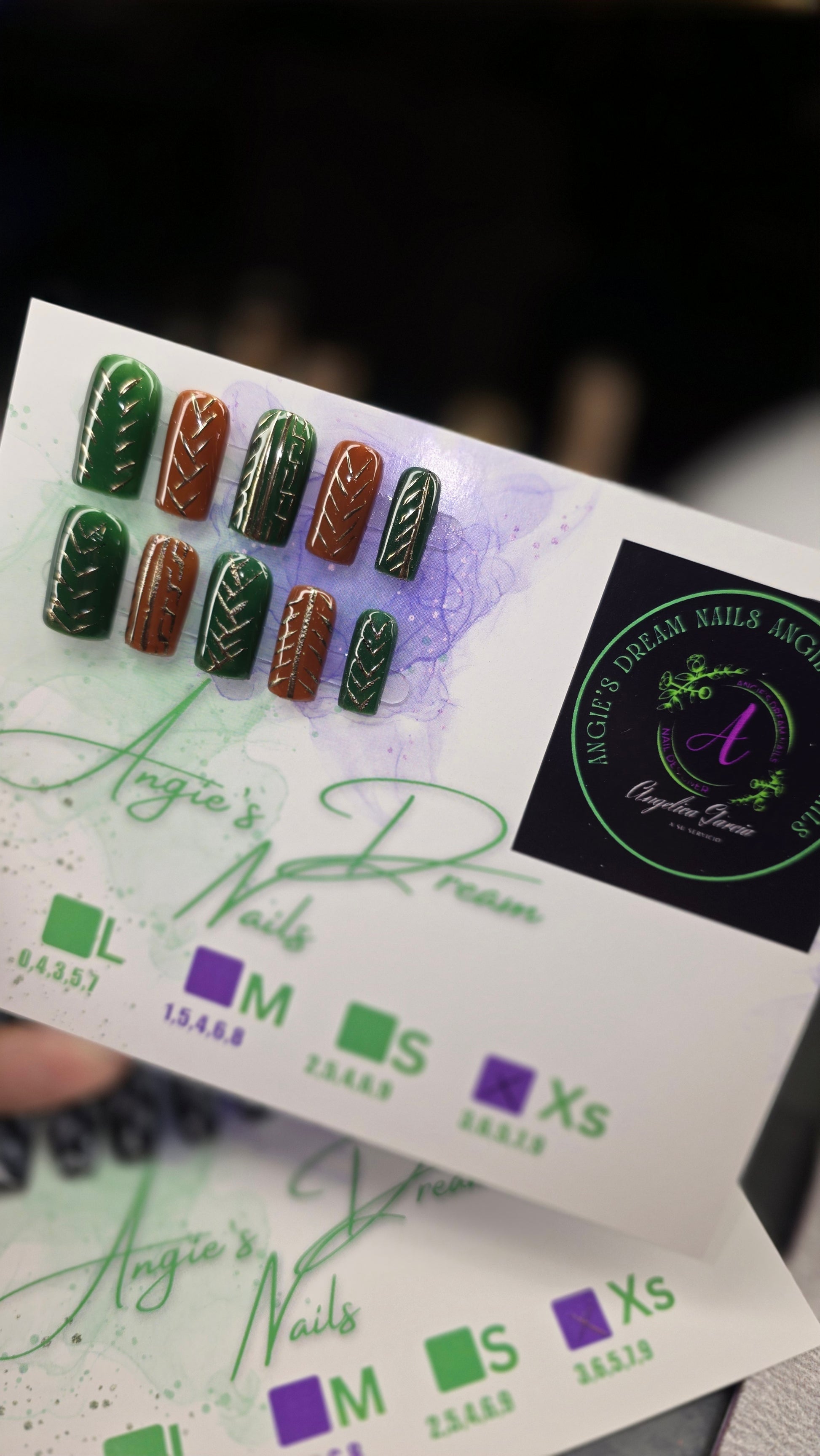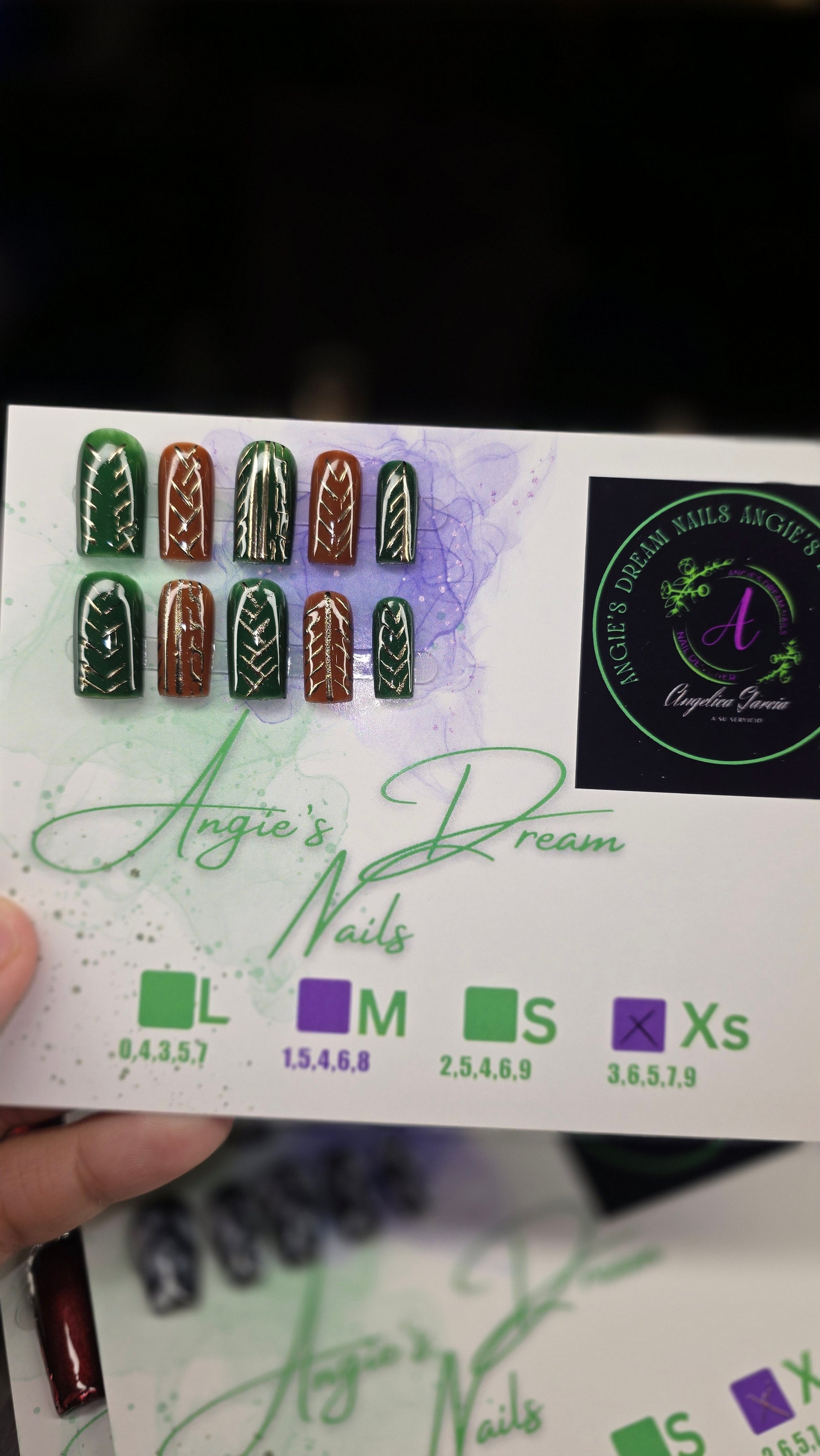 Bring the beauty of the outdoors to your fingertips with our stunning 'golden stitchpress-on nail set. This collection features a harmonious blend of deep emerald green and a rich, earthy rust/terracotta brown, both adorned with an elegant metallic gold design.